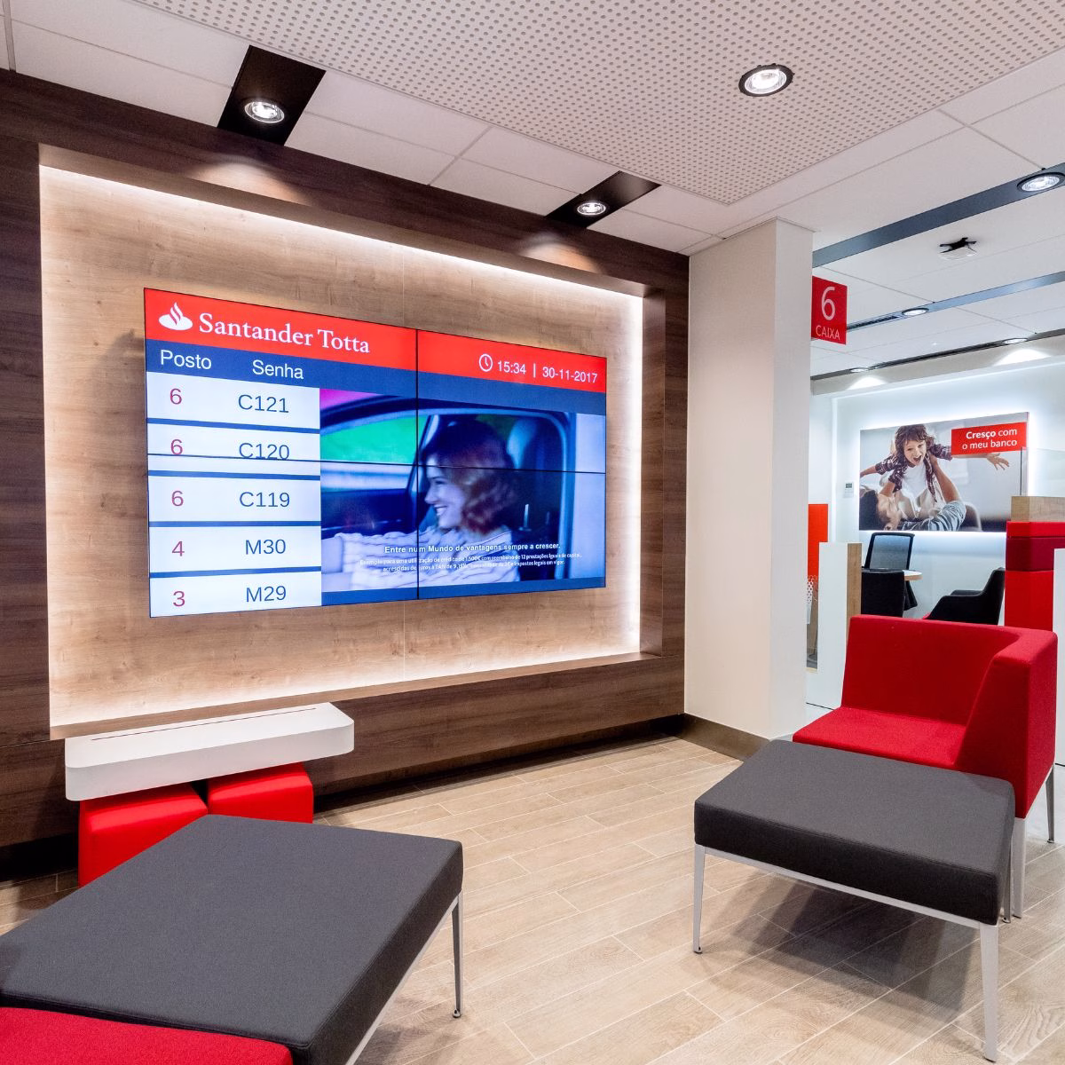 • Implementação em 350 balcões com quiosques de senhas digitais, ecrãs de chamada e integração com sistemas internos.